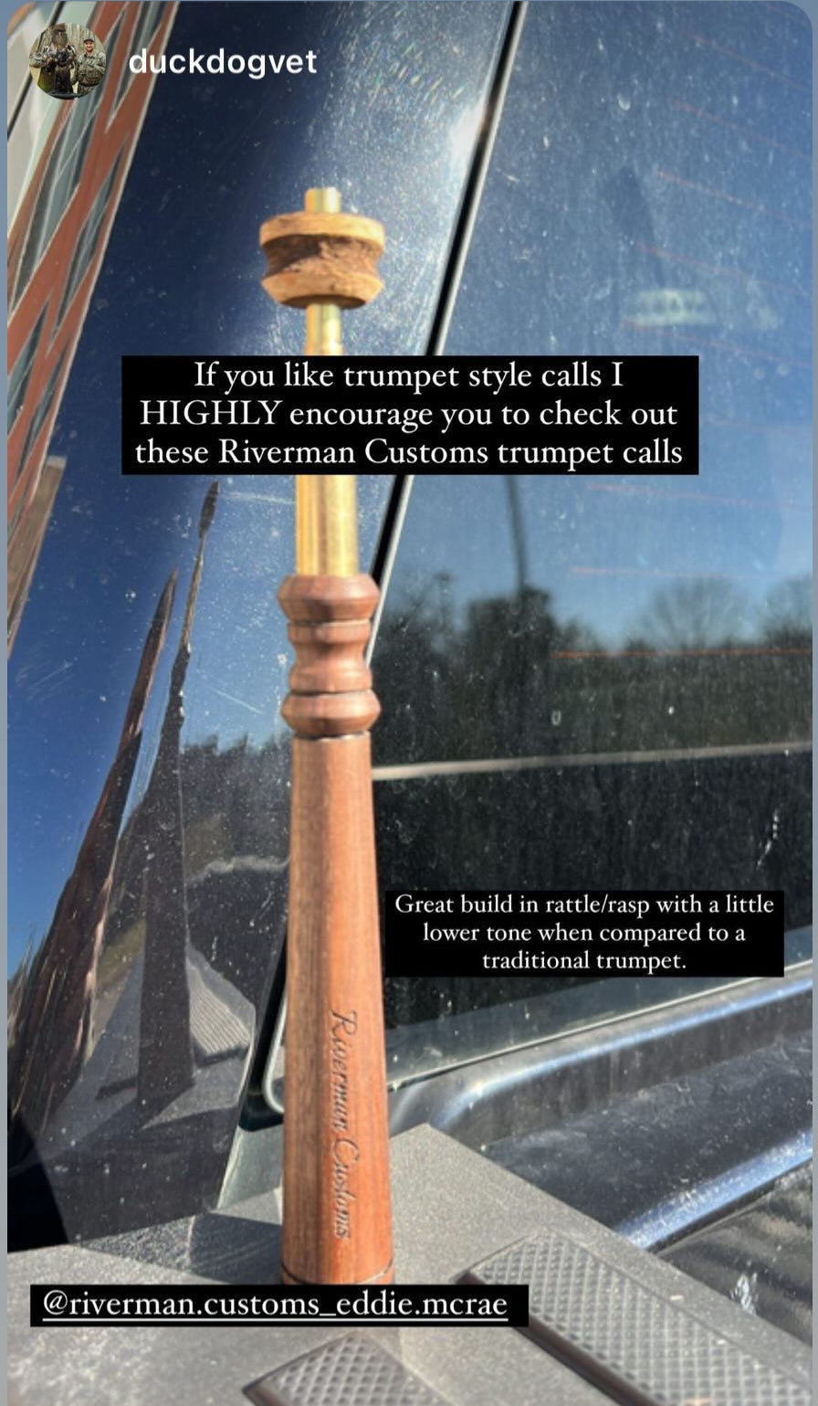 If you like trumpet style calls, I HIGHLY encourage you to check out these Riverman Customs trumpet calls! Great built-in rasp with a little lower tone when compared to a traditional trumpet. Thanks Riverman!